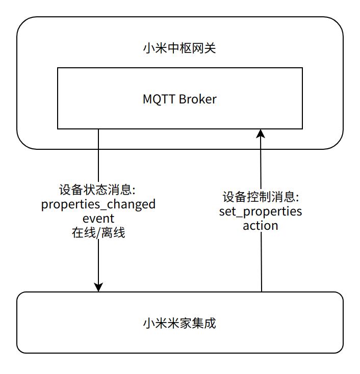 小米中枢网关内包含一个标准的 MQTT Broker ,实现了完整的订阅发布机制。米家集成向小米中枢网关订阅关注的设备消息。当设备属性发生改变或产生设备事件时,设备向小米中枢网关发送上行消息, MQTT Broker 向米家集成推送订阅的设备消息。